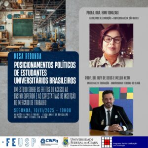 Data da publicação: 1 de dezembro de 2025 Categoria: Sem categoriaNo dia 10 de novembro de 2025 ocorreu a mesa redonda Posicionamentos políticos de estudantes universitários brasileiros: um estudo sobre os efeitos do acesso ao ensino superior e as expectativas de inserção no mercado de trabalho, ministrado pela profa. dra. Kimi Tomizaki, da Faculdade de Educação da Universidade de São Paulo (USP), e pelo prof. dr. Ruy de Deus e Mello Neto, da Faculdade de Educação da UFC. O evento foi promovido pela Faculdade de Educação da UFC em parceria com a FEUSP, o CNPq e o Programa de Pós-Graduação em Sociologia (PPGS), representado pelo Lepec.