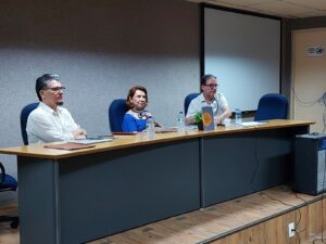 Professores Cristian, Irlys e Luis Miguel na mesa de encerramento do Ciclo.