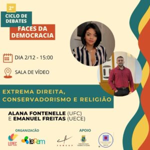 O Ciclo iniciou no dia 02/12 às 15h com a mesa redonda Extrema Direita, Conservadorismo e Religião, com participação da professora Alana Fontenelle (UFC) e do professor Emanuel Freitas (UECE), e mediação da coordenadora do Lepec, professora Danyelle Nilin Gonçalves. Reunindo alunos do Programa de Pós-Graduação em Sociologia da UFC e da graduação em Ciências Sociais, além de professores da UFC e da UECE, a mesa contou com um bom debate. A mesa ocorreu na Sala de Vídeo do Departamento de Ciências Sociais.