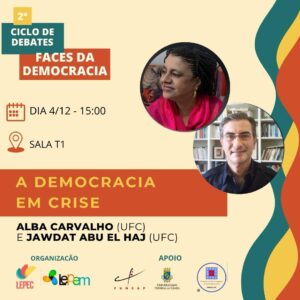 A programação continuou no dia 04/12, primeiro, com a mesa redonda A Democracia em Crise, com exposição da Professora Titular do Departamento de Ciências Sociais, Alba Carvalho, e comentários do professor Jawdat Abu El Haj, também da UFC, reunidos na Sala Térrea 1, do CH III, a partir das 15h. A profa. Alba e o prof. Jawdat versaram sobre os desafios da democracia na contemporaneidade, com destaque à situação brasileira, latino-americana e dos Estados Unidos.