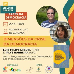 O Ciclo se encerrou com a mesa redonda Dimensões da Crise da Democracia, que teve mediação do professor Cristian Paiva, coordenador do Programa de Pós-Graduação em Sociologia, comentários da professora Irlys Barreira, fundadora e coordenadora emérita do Lepec, e exposição do professor Luis Felipe Miguel, da Universidade de Brasília (UnB), que também fez o lançamento do livro Democracias em Crise, Teorias em Transe.