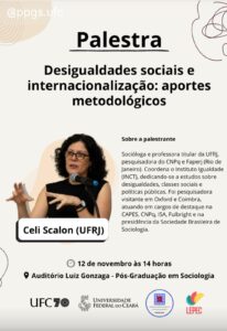 Data da publicação: 1 de dezembro de 2025 Categoria: Sem categoriaNo dia 12 de novembro de 2025 ocorreu a palestra Desigualdades Sociais e Internacionalização: aportes metodológicos, ministrado pela professora titular da Universidade Federal do Rio de Janeiro (UFRJ) e pesquisadora do CNPq e Faperj, Celi Scalon. O evento foi promovido pelo Lepec, em parceria com o Programa de Pós-Graduação em Sociologia (PPGS) da UFC, e é parte do ciclo comemorativo dos 25 anos de fundação do laboratório, a ocorrem em 2026.